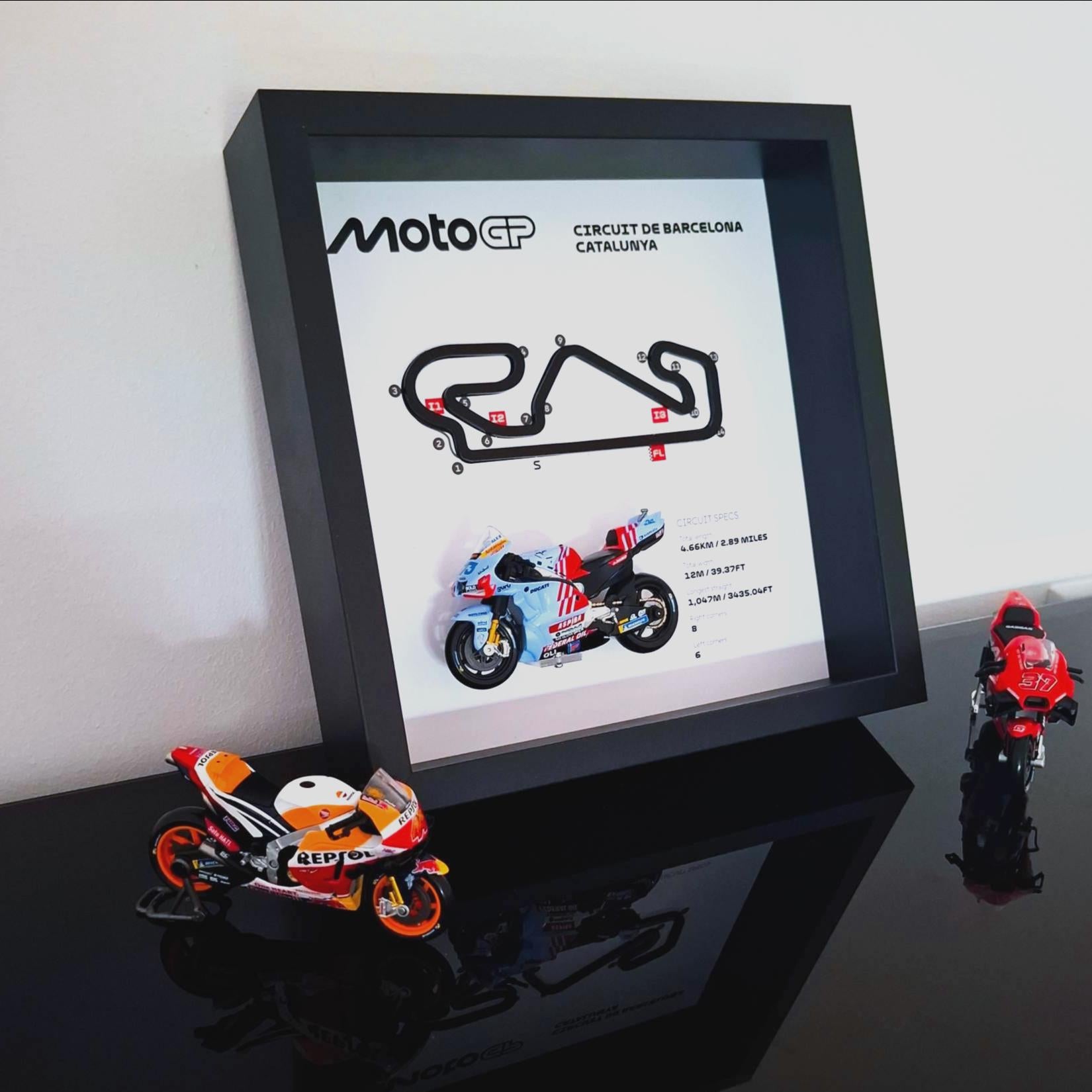 Svaki komad sadrži detaljan model motocikla u mjerilu 1:43 (odaberite između 10 različitih motocikala) postavljen na visokokvalitetnu tiskanu pozadinu koja dočarava duh staze.