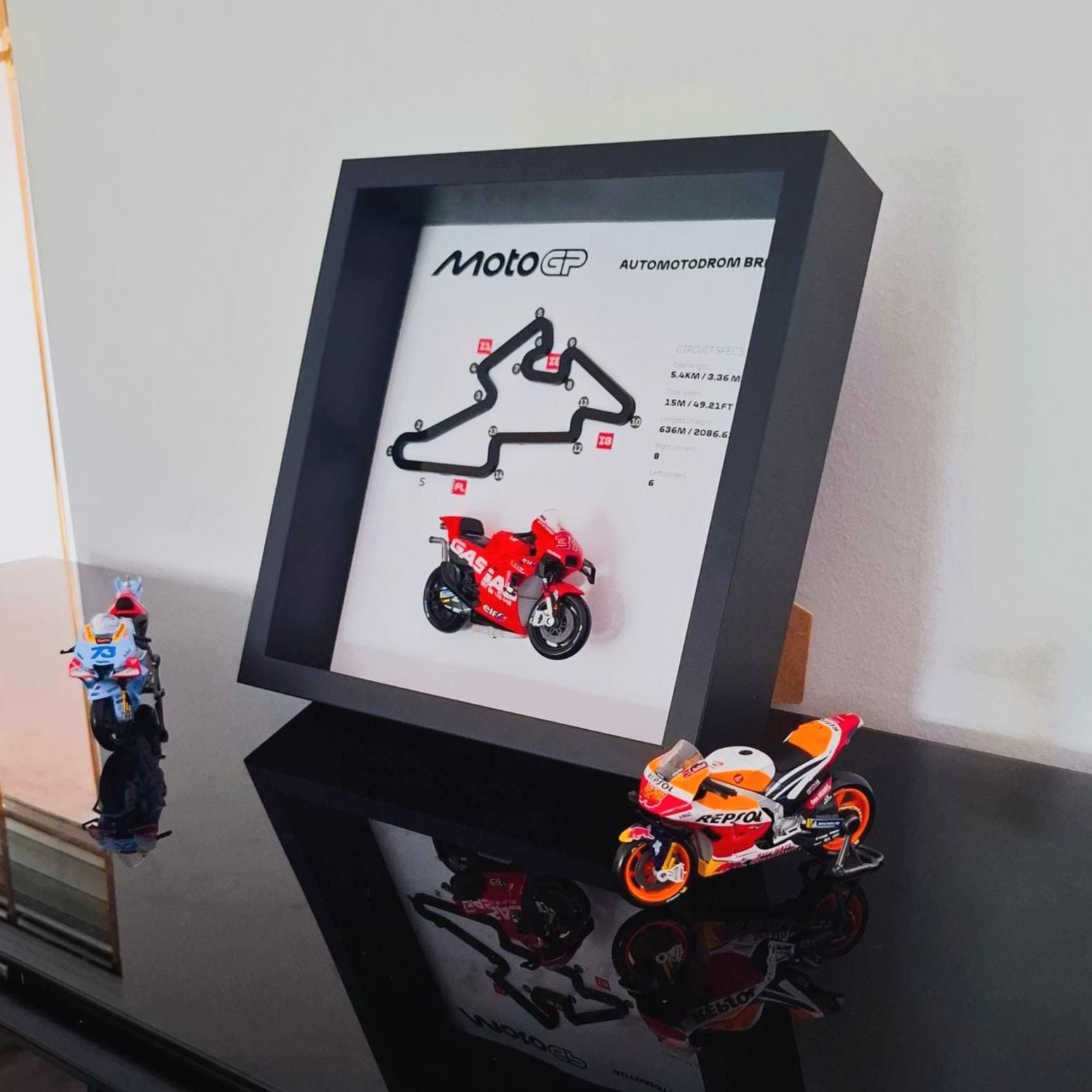 Unesite uzbuđenje moto utrka u svoj dom s ovim jedinstvenim 3D uokvirenim umjetničkim djelom. Dizajnirano za istinske ljubitelje motosporta, svaki komad spaja dubinu, detalje i stil kako bi stvorio upečatljiv prikaz.