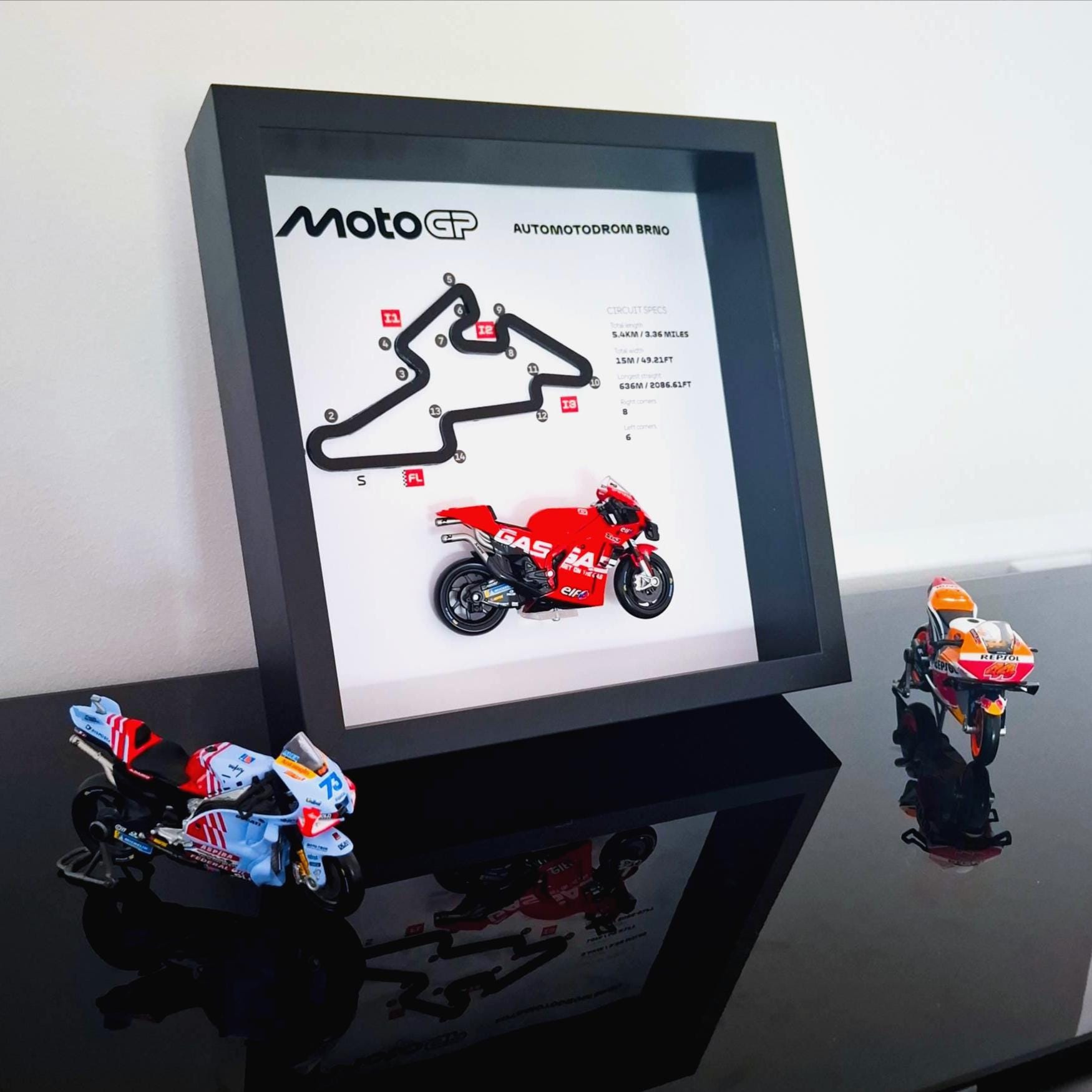 Svaki komad sadrži detaljan model motocikla u mjerilu 1:43 (odaberite između 10 različitih motocikala) postavljen na visokokvalitetnu tiskanu pozadinu koja dočarava duh staze.