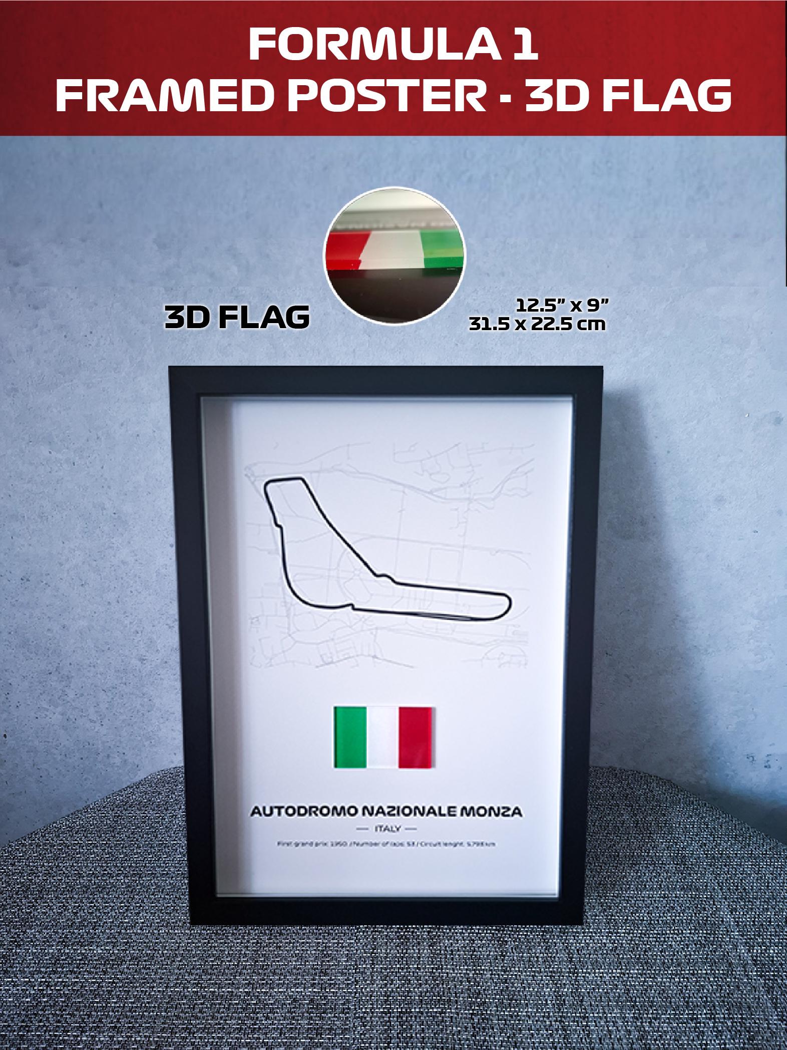 Uokvireni poster Monza Italija s 3D zastavom - Visokokvalitetna tiskana pozadina - 31,5 x 22,5 cm - Formula 1 poklon
