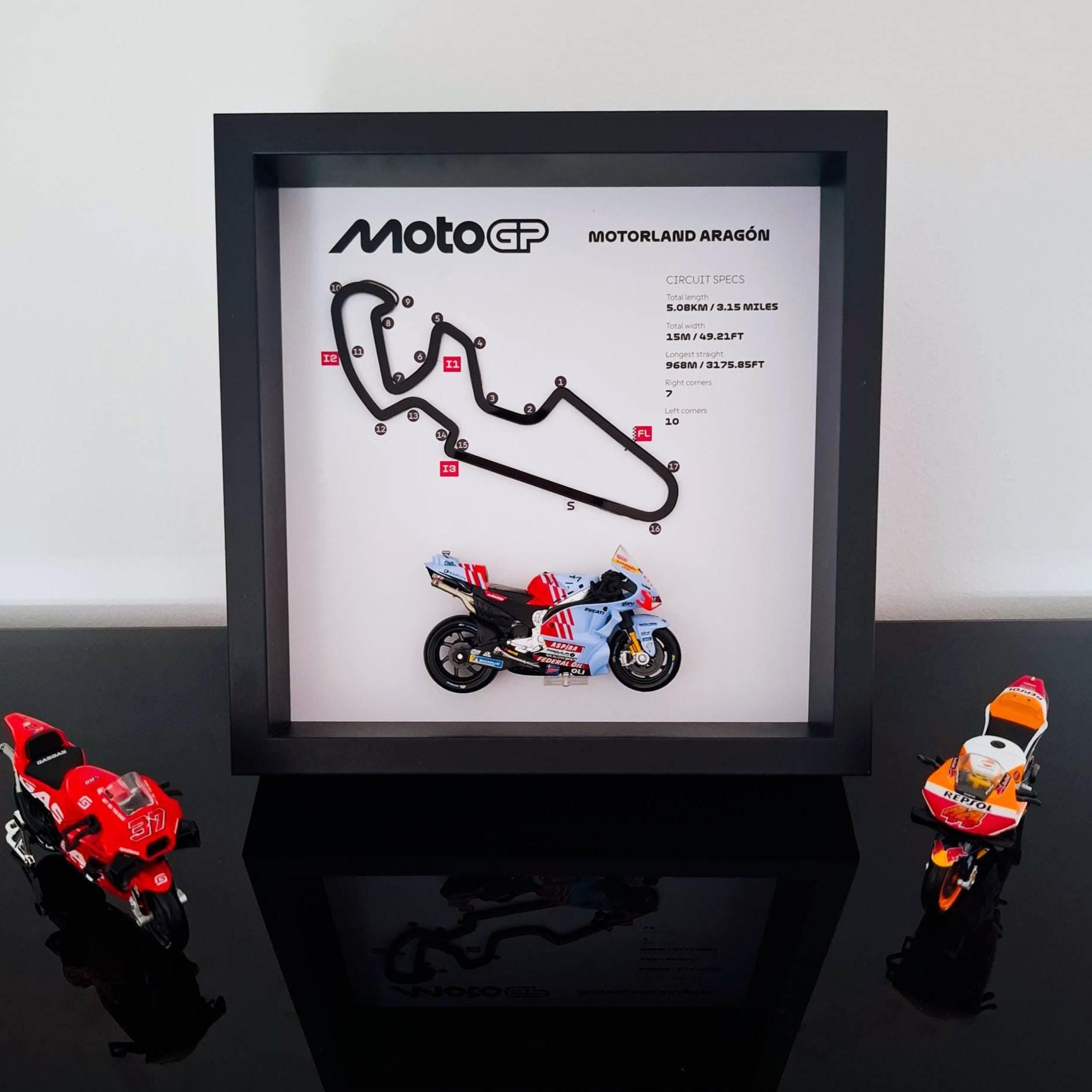 Svaki komad sadrži detaljan model motocikla u mjerilu 1:43 (odaberite između 10 različitih motocikala) postavljen na visokokvalitetnu tiskanu pozadinu koja dočarava duh staze.