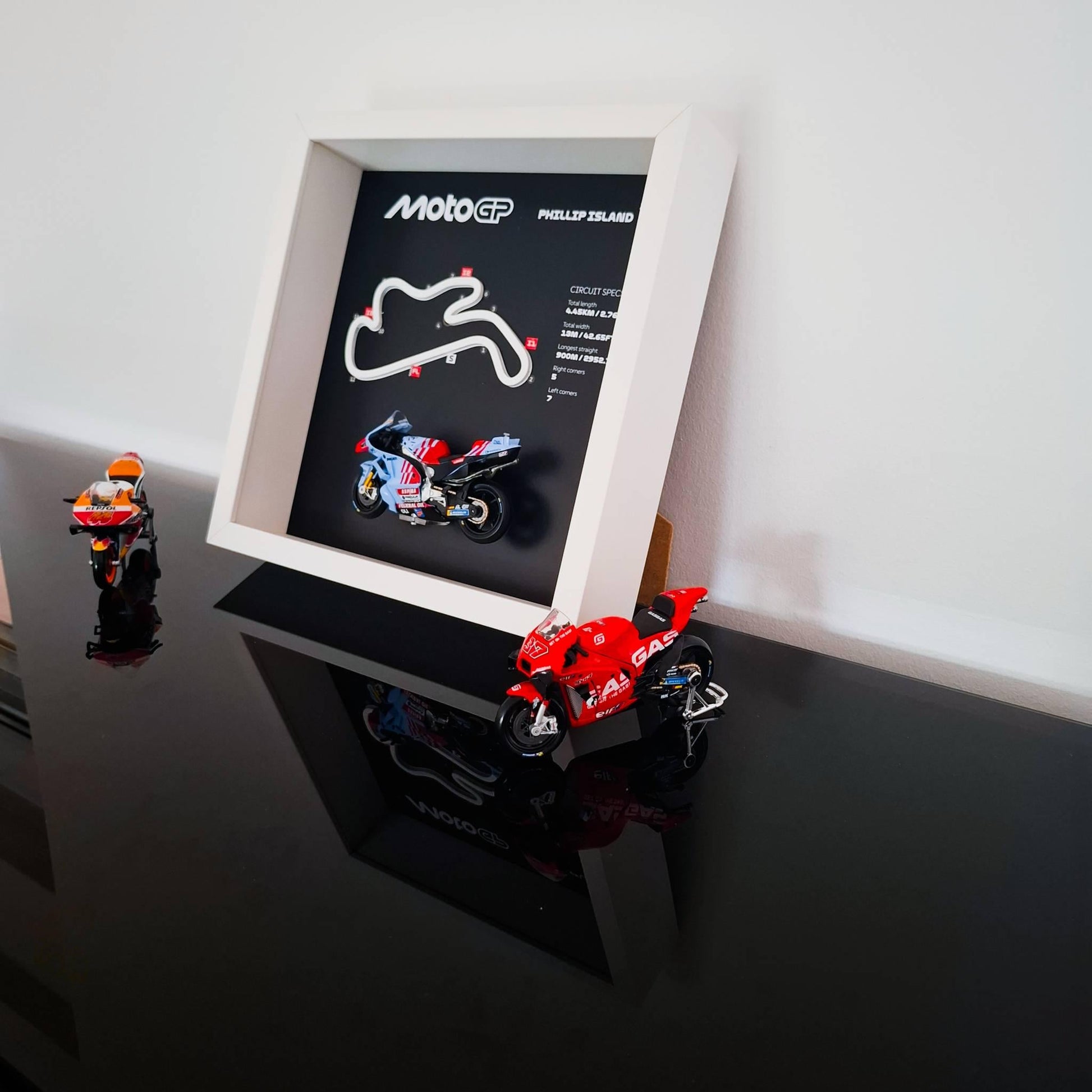 Svaki komad sadrži detaljan model motocikla u mjerilu 1:43 (odaberite između 10 različitih motocikala) postavljen na visokokvalitetnu tiskanu pozadinu koja dočarava duh staze.