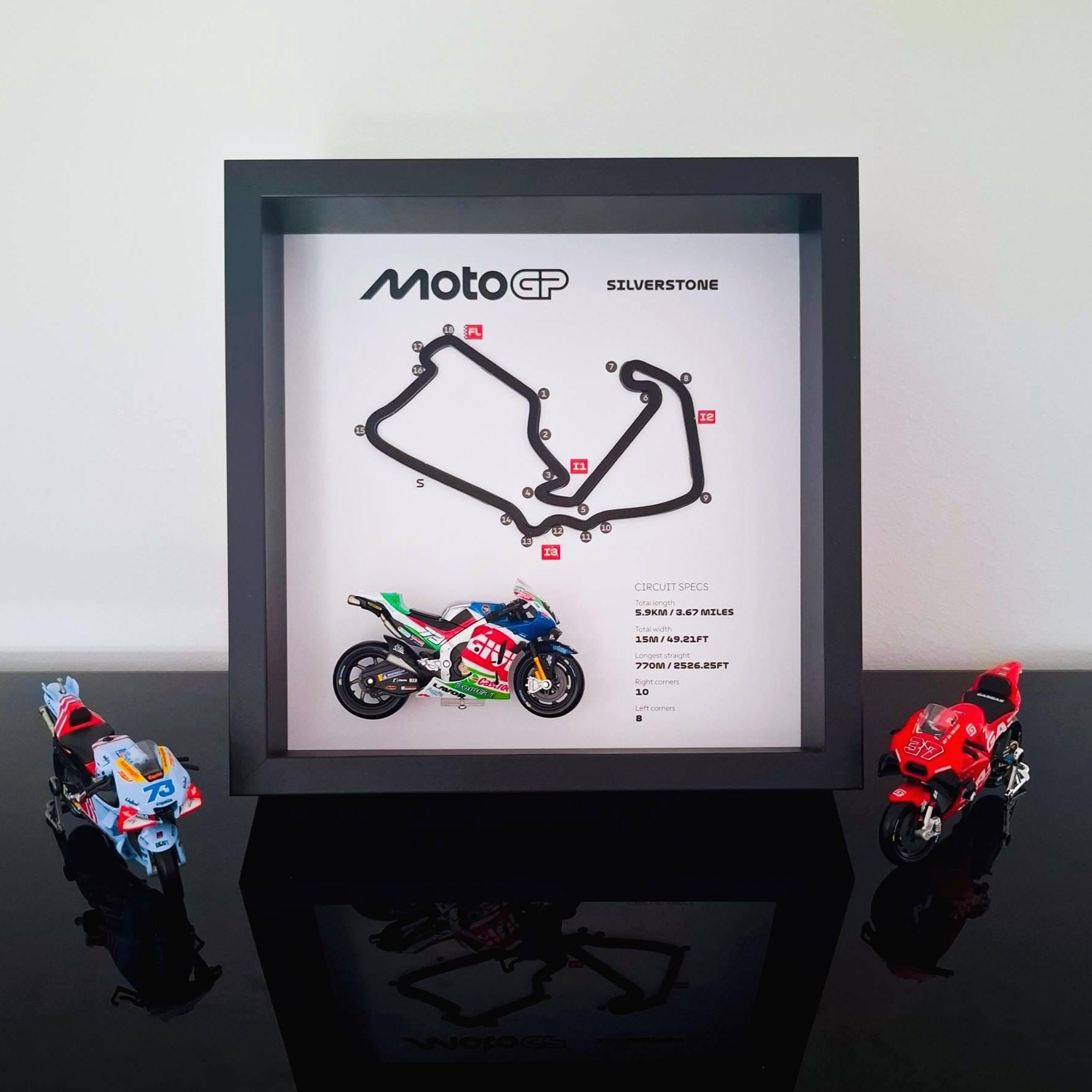 Svaki komad sadrži detaljan model motocikla u mjerilu 1:43 (odaberite između 10 različitih motocikala) postavljen na visokokvalitetnu tiskanu pozadinu koja dočarava duh staze.